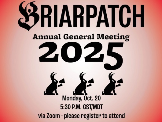 At our AGM, we'll be electing new members to our board of directors. If you are interested in joining the Briarpatch board, please contact chair [at] briarpatchmagazine [dot] com. A handy signup form is coming soon!