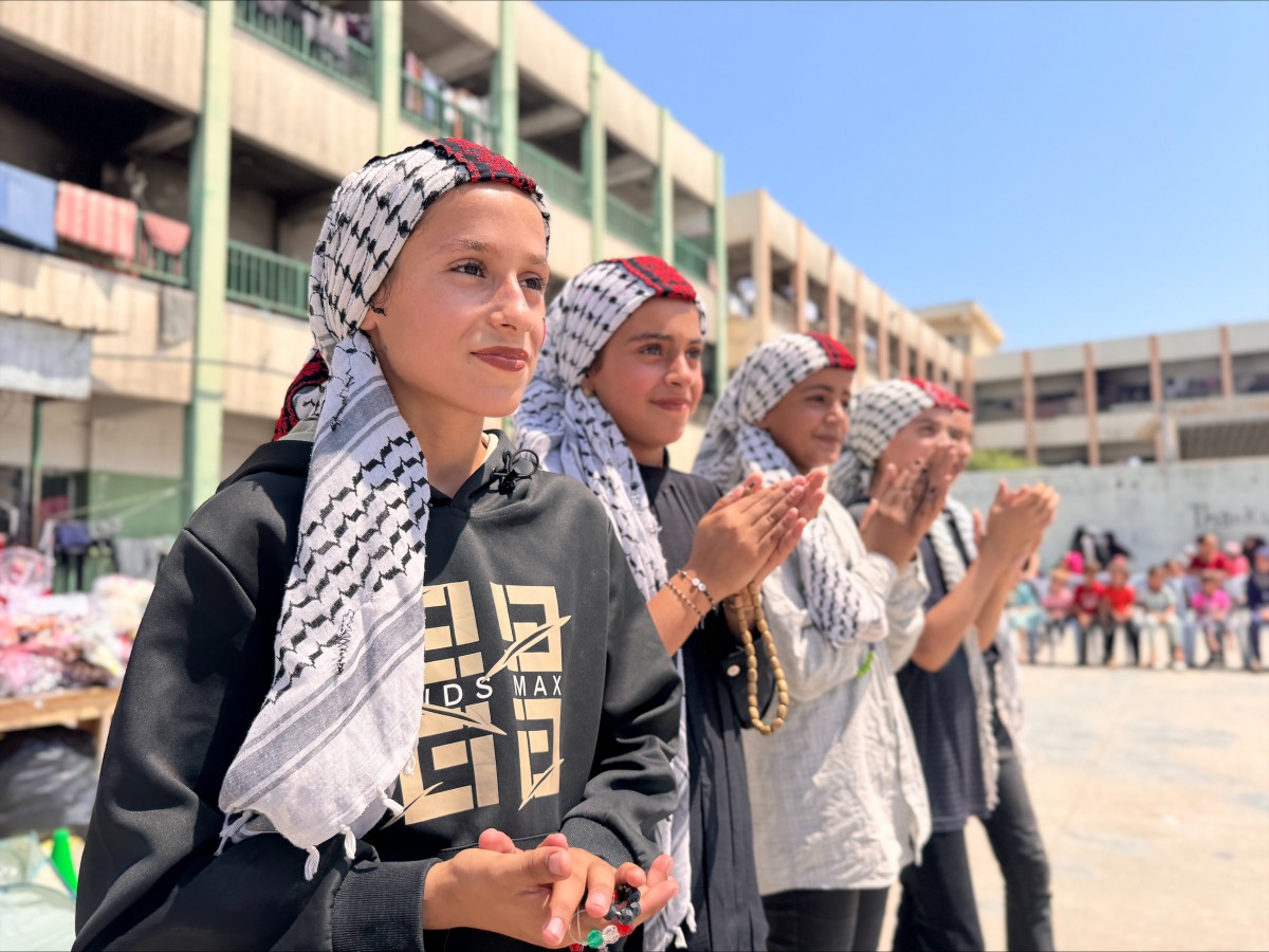 Displaced girls inside the Iwa school form a dabke group and perform during a festival at the school. Photo by Younis.