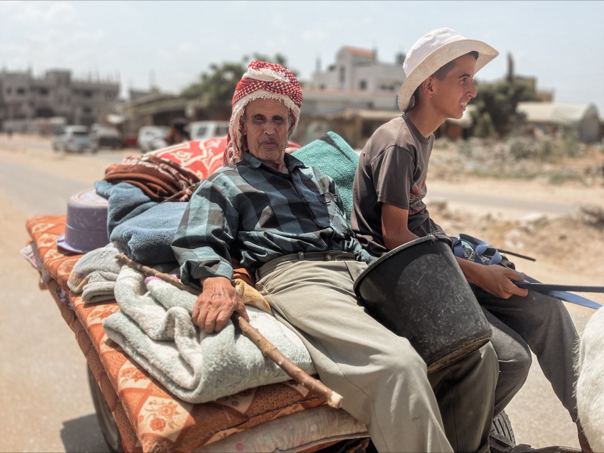 A family displaced from Al-Maghazi camp after Israel issued evacuation orders. They are pictured with a number of their belongings on a wagon. Photo by Younis.